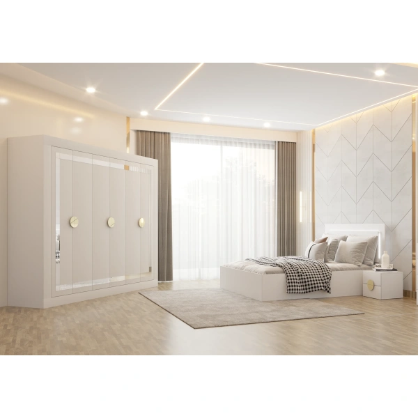 Este prevăzut cu uși batante, fiecare ușă fiind decorată cu oglindă aplicată integral, care funcționează atât ca element practic, cât și ca ornament decorativ, amplificând vizual spațiul și adăugând un plus de eleganță. Mânerele aurii completează designul printr-un contrast sofisticat, oferind un aspect luxos și modern.